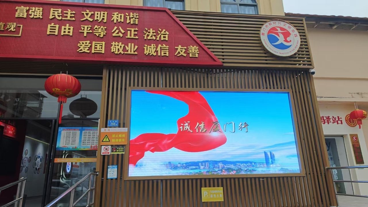充分利用街道、社区办公场所、商业综合体、居民小区等处的电子显示屏,滚动播放诚信主题公益广告、宣传片及标语。精选《诚信是金》《信用厦门 共建共享》等宣传内容,实现宣传常态化展示。