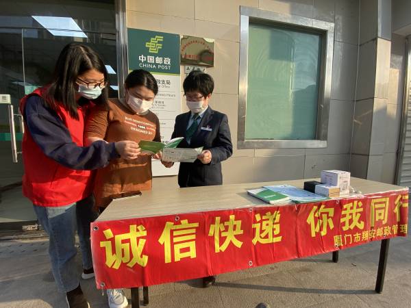 为加强消费者权益保护,引导邮政快递企业树立知法守法经营理念,营造一个诚实守信的邮政快递市场环境和消费环境,在“3·15”国际消费者权益日到来之际,厦门市翔安邮政管理局深入邮政快递网点开展“诚信快递,你我同行”主题宣传活动。