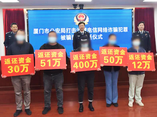现场向5名受骗群众返还被骗资金543万元,创下了厦门市集中返还数额的历史之最。其中,单起返还群众被骗资金400万元,为厦门市迄今为止单次返还金额最大的案例。自2021年12月7日,厦门市公安局启动全社会反诈云联盟“传橙点亮行动”以来,市民群众踊跃参与,通过线上闯关答题、分享专属海报等方式,学习防骗知识,赢取反诈积分,掀起全社会反诈新热潮,涌现出一大批学习反诈知识、宣传反诈知识的“反诈达人”,其中反诈积分排名前十的获得“王者卫士”称号,活动现场对“王者卫士”发放了10部智能手机奖品。